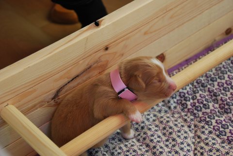 I går var den første af hvalpene på vej over rundstokkene i hvalpekassen. Det var den først fødte lyserød tæve. Lyserød er også begyndt at øver sig i at holde balancen på alle 4 ben, men det går ikke så godt endnu, den lander for det meste på ryggen, og ruller rundt :-)
